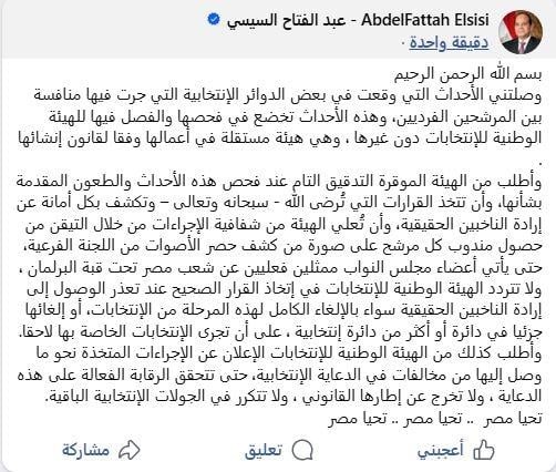 وكتب الرئيس عبر حسابه الرسمي على "فيس بوك": بسم الله الرحمن الرحيم.. وصلتني الأحداث التي وقعت في بعض الدوائر الانتخابية التي جرت فيها منافسة بين المرشحين الفرديين، وهذه الأحداث تخضع في فحصها والفصل فيها للهيئة الوطنية للانتخابات دون غيرها، وهي هيئة مستقلة في أعمالها وفقا لقانون إنشائها .